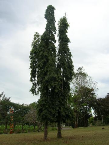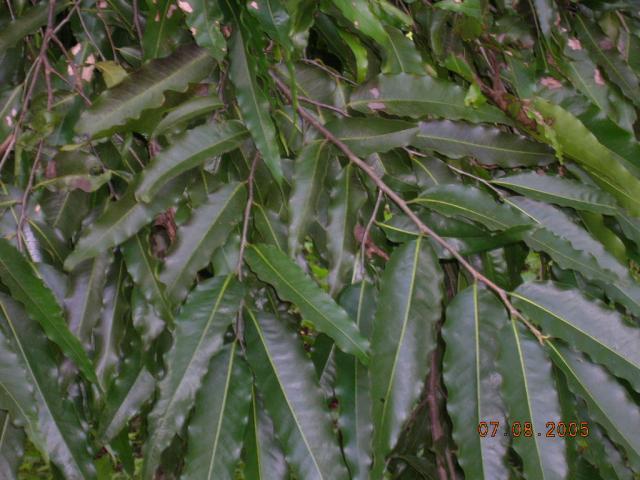 | Botanical Features | Tall trees, internode 2-2.7 cm; bole straight; crown conical; bark greyish-brown, smooth; young branches spreading, pendulous, slender, glabrous or sparsely puberulous when young. Leaves simple, alternate, distichous, estipulate; petiole 10-15 mm, pubescent when young, slender; lamina 15-23 x 2-4 cm, ovate-lanceolate or lanceolate; base round; apex acuminate; margin entire, strongly undulate, glabrous, shining above and dull beneath, coriaceous, lateral nerves up to 30 pairs, obscure, pinnate, flowers bisexual, green; fruit aggregate of berries; berry 2.5 x 1.5 cm ovoid to ellipsoid, obtuse at both ends, glabrous, reddish to black; seed one, almost ovoid, smooth or slightly grooved, pale brown, shiny. |