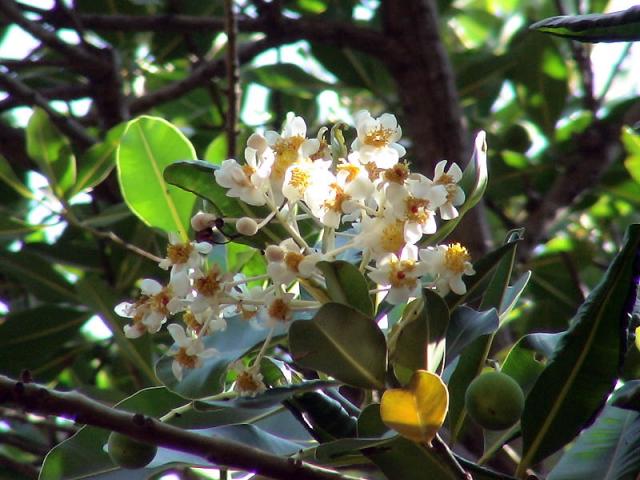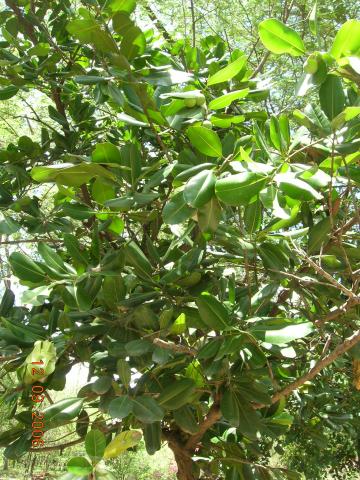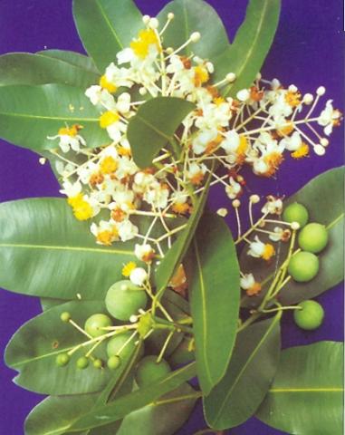 | Botanical Features | Tree, to 20 m tall; bark smooth or with boat-shaped fissures, brown to pale grey; exudate milky or yellow; branchlets compressed, glabrous. Leaves broadly elliptic-oblong or obovate, cuneate to rounded at base, slightly recurved and margined, rounded, acute, slightly emarginate, retuse or sub-acute at apex, coriaceous, glabrous; lateral nerves 4-20 pairs; petioles flat, 1-1.7 cm long, glabrous. Racemes axillary, (5-)7-12 flowered. Flowers polygamous, white, fragrant; bracts ovate, caducous; pedicels glabrous. Sepals 4, reflexed; concave, nerved; petaloid, nerved. Petals usually 4, rarely 3 or 5, obovate to elliptic or oblong, reflexed, rarely glabrous, nerved; anthers rounded or retuse at apex, Ovary globose-depressed, stipitate; style stigmas peltate, 3-5 radiate. Drupes globose to obovoid, short apiculate , smooth; stone subglobose. |