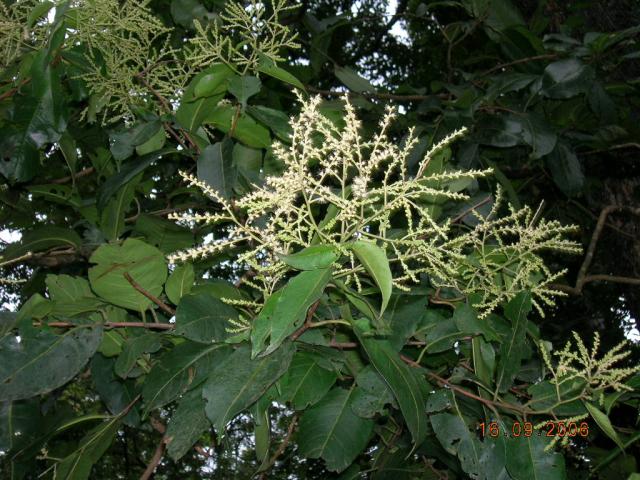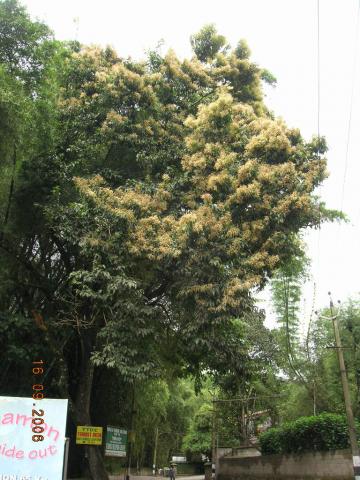 | Botanical Features | Deciduous trees, bole often fluted; bark surface brown, rough, vertical fissures shallow, fibrous, blaze reddish-pink, mottled; young parts silky pubescent; branchlets reddish. Leaves simple, lower leaves subopposite, upper alternate, exstipulate; petiole 12-15 mm long, stout, slightly grooved above, glabrous; lamina 10-24 x 5-10 cm, elliptic, oblong, ovate, elliptic-oblong or ovate-oblong, base round, obtuse, cordate or oblique; apex acute or acuminate, margin entire; rusty pubescent when young and glabrescent when mature, coriaceous, 2 sessile glands beneath the base of the lamina or at the junction of petiole and lamina; lateral nerve 5-15 pairs, pinnate, flowers bisexual, white, fruit a drupe 13 x 12 mm, reddish-brown, rusty tomentose, with one large and 2 small wings; seed one. |