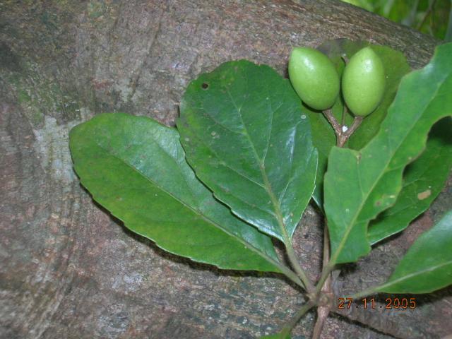 | Botanical Features | Trees, to 20 m high, aerial roots on large buttresseses; bark 8-10 mm thick brown, mottled with grey; blaze red. Branchlets, petioles, peduncles and young leaves densely pubescent. Leaves simple, alternate; petiole 15-40 mm, slender, pubescent, swollen tipped, with 2 minute glands at tip; lamina 5-14 x 2-6.2 cm, elliptic-obovate or elliptic ovate, base acute or cuneate, apex acute, caudate-acuminate or obtusely acuminate, margin crenate-serrate, glabrous, coriaceous; lateral nerves 3-8 pairs, pinnate, prominent, intercostae reticulate, slender, prominent, domatia glandular. Flowers bisexual, white, in axillary racemes to 8 cm long; sepals 5, ovate, pubescent on outside, densely glandulose, valvate; petals 5, laciniate, inserted round the base of glandular disc; stamens many, inserted between the glands on the disc; anthers not awned, tipped with hairs; ovary superior, densely tomentose, raised on torus, 3-celled, ovules 2 in each cell; style subulate, entire. Fruit a drupe, subglobose, green, style persistent; stone tubercled; seed one. |
