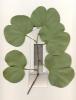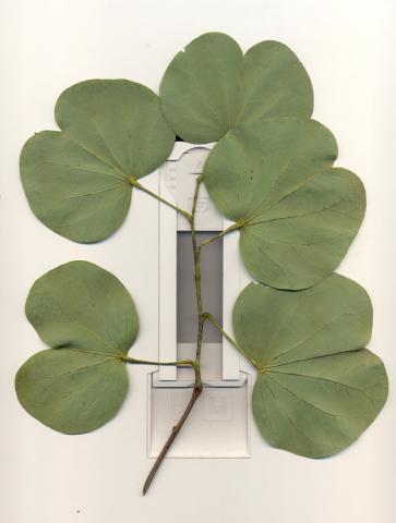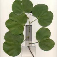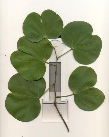 | Botanical Features | Deciduous trees, bark 10-15 mm thick, brown, rough, shallow with vertical and horizontal furrows, fibrous, exfoliating in long strips; blaze red, concentrically striated. Leaves simple, bilobed, alternate; stipules small, free, lateral, cauducous; petiole 25-30 mm long, slender, glabrous, swollen at tip and base; lamina 5-10 x 7-12.5 cm, broader than long, suborbicular, base cordate, apex obtuse, margin entire, glabrous above, slightly glaucous beneath, coriaceous; 9-11 nerves from the base, palmate, prominent, intercostae reticulate, prominent. Flowers bisexual, 6-8 mm across, cream coloured, in axillary corymbs; fruit a pod, 25-30 x 1.8-2.5 cm, straight, flattened, beaked, longitudinally striate, glabrous; seeds 20-30, oblong. |