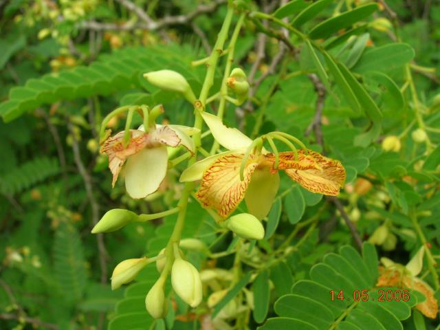 | Botanical Features | Trees, bark brown to brownish-black, rough with vertical fissures; branchlets warty, tomentose. Leaves paripinnate, alternate; stipules lateral, minute, cauducous; rachis 8-13 cm long, slender, glabrous, pulvinate; leaflets 20-34, opposite, sessile, lamina 1.5-4 x 0.4-1.3 cm, oblong, base unequal, apex obtuse, margin entire, glabrous, lateral nerves 10-15 pairs, pinnate, slender, obscure, looped at the margin forming intramarginal nerve; flowers bisexual, yellow with reddish-pink dots, fruit a pod, oblong, mesocarp pulpy, endocarp septate, leathery, indehiscent; seeds 3-8 or more, obovoid-orbicular, compressed, brown. |