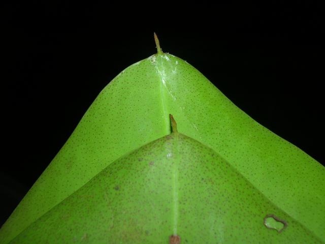 | Botanical Features | Evergreen trees, branches horizontal; trunk and lower branches supported by numerous profusely looping stilt-roots and prop roots, lenticellate, bark brown, longitudinally fissured; branchlets, terete, brownish-green, glabrous, with prominent, rough, thick, brown layer of stipular scar, prominent. Leaves simple, opposite decussate, stipulate, clustered at the shoot apex; stipules 2, interpetiolar, 6 x 1.2 cm, pale green with pinkish tinge, overlapping the apical bud, subcylindric; petiole 25-35 mm long, stout, glabrous, grooved above, pale green; lamina 12.5-14.5 x 5.5-8.5 cm, elliptic-ovate, base cuneate, apex mucronate, glabrous, coriaceous, green above, pale green beneath with numerous black dots; lateral veins 8-9 pairs, pinnate, flowers yellowish-white, fruit a drupe, 5-7 cm long, ovoid or conoid, pericarp brown, thick, leathery, glabrous, seed one. |