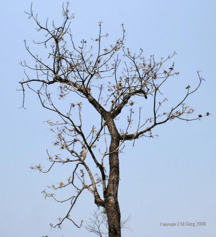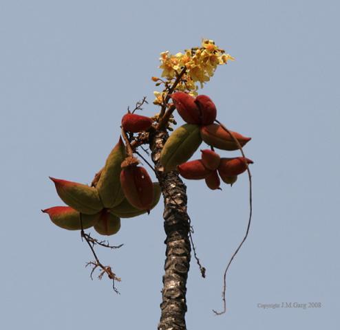 | Botanical Features | Deciduous trees, bark pale-brown, smooth with small corky warts; blaze red; branches horizontal and whorled. Leaves simple, palmately 5-7 lobed, alternate, crowded at the end of branchlets; stipules free, lateral, cauducous; petioles 7-25 cm long, stout, swollen at base, pubescent; lamina 6.5-45 x 9-45 cm, lobes oblong-ovate or ovate, base cordate, apex acuminate or caudate-acuminate, margin entire, glabrous above and downy beneath, coriaceous; 5-7-ribbed from the base, palmate, prominent, lateral nerves 4-8, parallel, prominent, flowers cream-coloured, 10-12 mm across, in long drooping panicles; fruit an aggregate of 2-7 follicles, each 3.5-7.5 cm long, brown, tomentose, seeds many, black, smooth. |