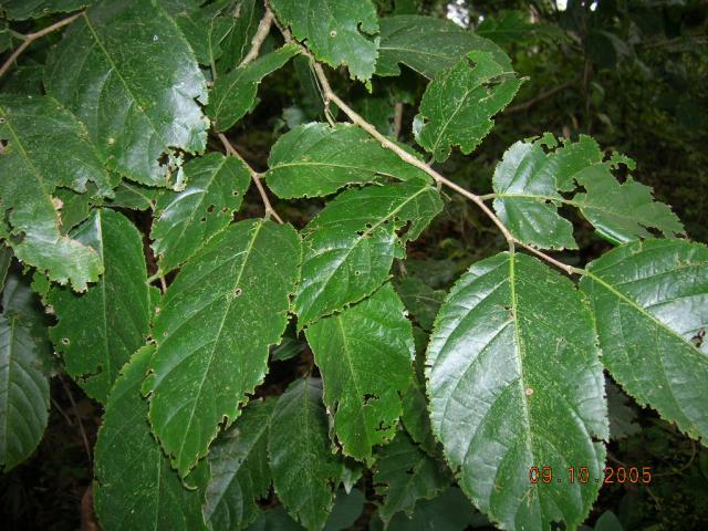| Botanical Features | Large deciduous trees, to 25 m high, bark 6-8 mm thick, whitish-grey, smooth; blaze yellowish-grey, streaked with light brown; branchlets pubescent. Leaves simple, alternate; stipules lateral, scarious; petiole 5-10 mm, stout, pubescent; ovate-oblong, ovate or elliptic-ovate, base rounded or subcordate, apex acuminate, margin entire, distantly serrate when young, coriaceous, glabrous above, appressed pubescent punctate below; lateral nerves 6-9 pairs, pinnate, prominent, intercostae reticulate, prominent. Flowers polygamous, appear before leaves, 5-8 mm across, greenish-purple, in axillary fascicles; tepals 4 or 5, free, anthers pubescent; female flowers with longer pedicels; ovary superior, compressed, long stipitate, 2-winged, 1-celled, ovule 1; style 2 fid. Fruit a samara, 3 cm across, orbicular, wings nerved, glabrous, seed one. |